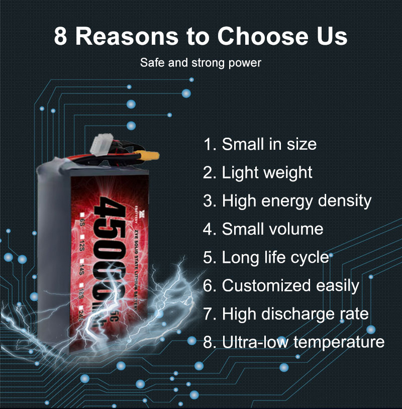 Tilpassbare løsninger: Vi tilbyr OEM/ODM -tjenester for å lage HV -ladingsløsninger tilpasset dine spesifikke batterikrav, inkludertLett solid-state litiumbatteri 32000mAh 30000mAh 5C10C Enkel å tilpasse 2S3S4S5S6S UAVS Batteripakke.